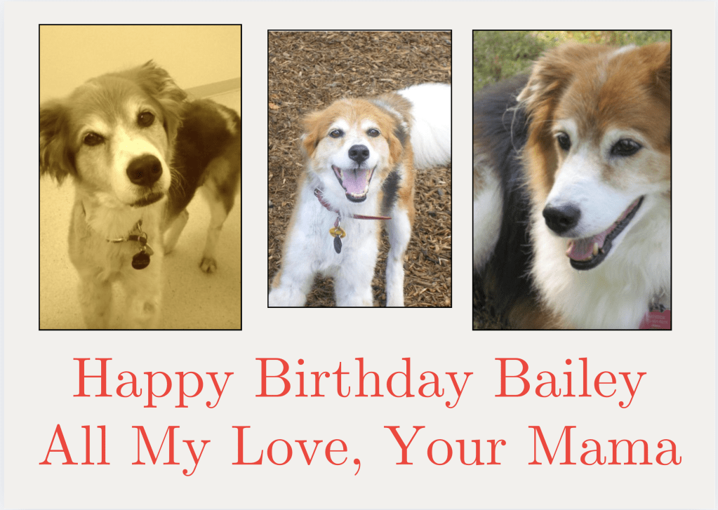 June 20, 2008, is the day I walked into Angels for Animals looking for you after searching around on their site. There you were in your cage, so happy someone would come visit you and take you for a walk outside. You were 7 years old and had been returned twice. Why that was, I can never imagine. I took you for a short walk outside, and I think it took only 1 second to fall in love with you, my first dog with the biggest brown eyes in the world. Happy eyes. I walked back in and said that I wanted to adopt you. They literally said, “You want to adopt Bailey?” They were seemingly in shock and went and got some papers for me to fill out, and they said they would have to make a phone call to someone to let them know. They called Maryann, whose desk you used to sit under, and as I was writing the check for your adoption fee, they told me that Maryann said that I had better be good to you or she was going to come after me. I remember telling them to assure her that you would have the most amazing life with us! And you did. I miss you every single day, my darling daughter. Your leash is always in the car, so you are always with me. Your pictures are everywhere, and we have our book, Letters To Each Other, which we wrote together and published. I know you were there for Joy when she came over the Bridge on April 2nd. Thank you for being there, I knew you would. I got the sign you sent, and I guess you both decided awfully quick that Shadow would be the next one to rescue.